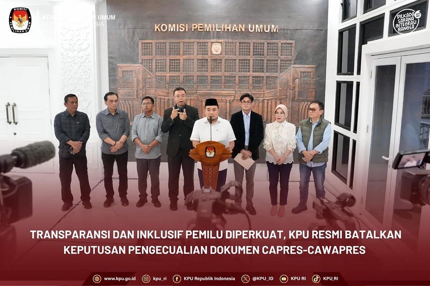 #TemanPemilih, sejalan dengan komitmen KPU untuk menjunjung tinggi prinsip transparansi, terbuka, dan inklusif dalam tata kelola informasi—dalam rangka memberikan pelayanan informasi yang lebih luas serta menjamin akses masyarakat yang merata terhadap informasi publik—KPU secara kelembagaan memutuskan untuk membatalkan Keputusan KPU Nomor 731 Tahun 2025 tentang Penetapan Dokumen Persyaratan Pasangan Calon Presiden dan Calon Wakil Presiden sebagai Informasi Publik yang dikecualikan.