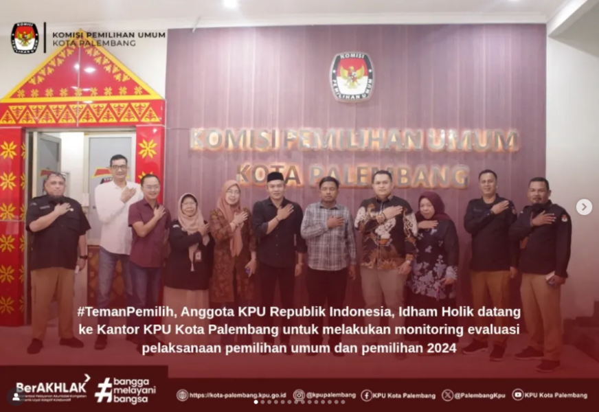 #TemanPemilih, Anggota KPU Republik Indonesia, Idham Holik datang ke Kantor KPU Kota Palembang untuk melakukan monitoring evaluasi pelaksanaan pemilihan umum dan pemilihan 2024, diterima langsung kedatangan beliau oleh Ketua dan Anggota KPU Kota Palembang, Sekretaris dan Kasubbag KPU Kota Palembang.