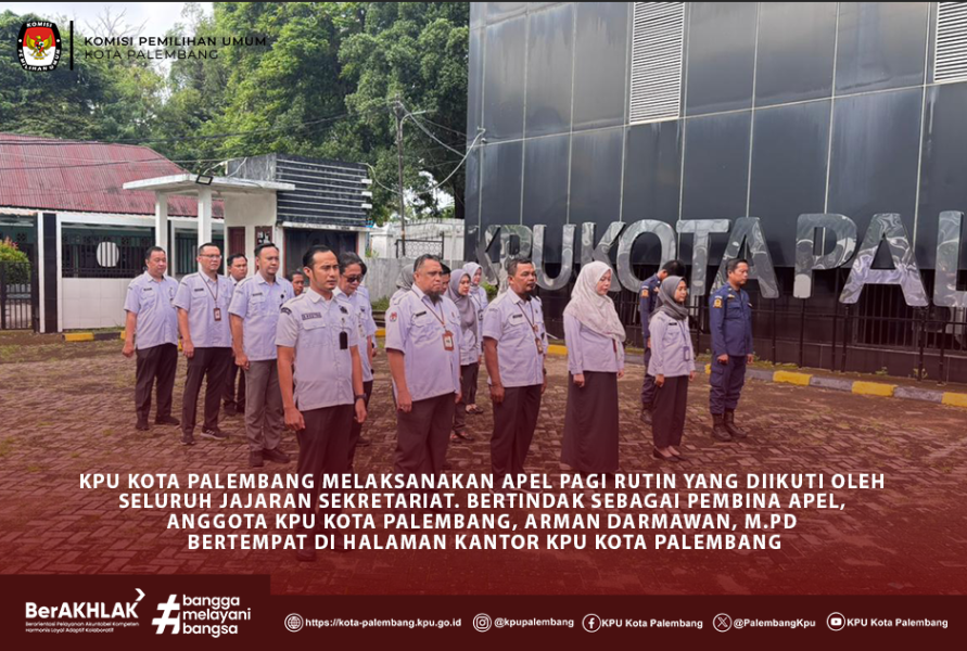 #TemanPemilih, KPU Kota Palembang melaksanakan Apel Pagi Rutin yang diikuti oleh seluruh jajaran Sekretariat. Bertindak sebagai Pembina Apel, Anggota KPU Kota Palembang, Arman Darmawan, M.Pd bertempat di halaman kantor KPU Kota Palembang.