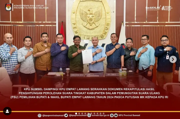 #Temanpemilih Ketua KPU Sumsel, Bapak Andika Pranata Jaya; Anggota Divisi Teknis Penyelenggaraan Pemilu, Bapak Handoko; Anggota Divisi Hukum dan Pengawasan, Bapak Nurul Mubarok; Anggota Divisi Perencanaan Data dan Informasi serta Sekretaris, Bapak Eko Iswantoro mendampingi Jajaran KPU Empat Lawang Menyampaikan dokumen rekapitulasi hasil penghitungan perolehan suara tingkat Kabupaten dalam Pemungutan Suara Ulang (PSU) pemilihan Bupati dan Wakil Bupati Empat Lawang tahun 2024 pasca putusan Mahkamah Konstitusi, Selasa (29/4/2025). Dokumen tersebut diserahkan langsung kepada Anggota KPU RI Divisi Teknsi Penyelenggaraan, Bapak Idham Kholik di Kantor KPU RI.