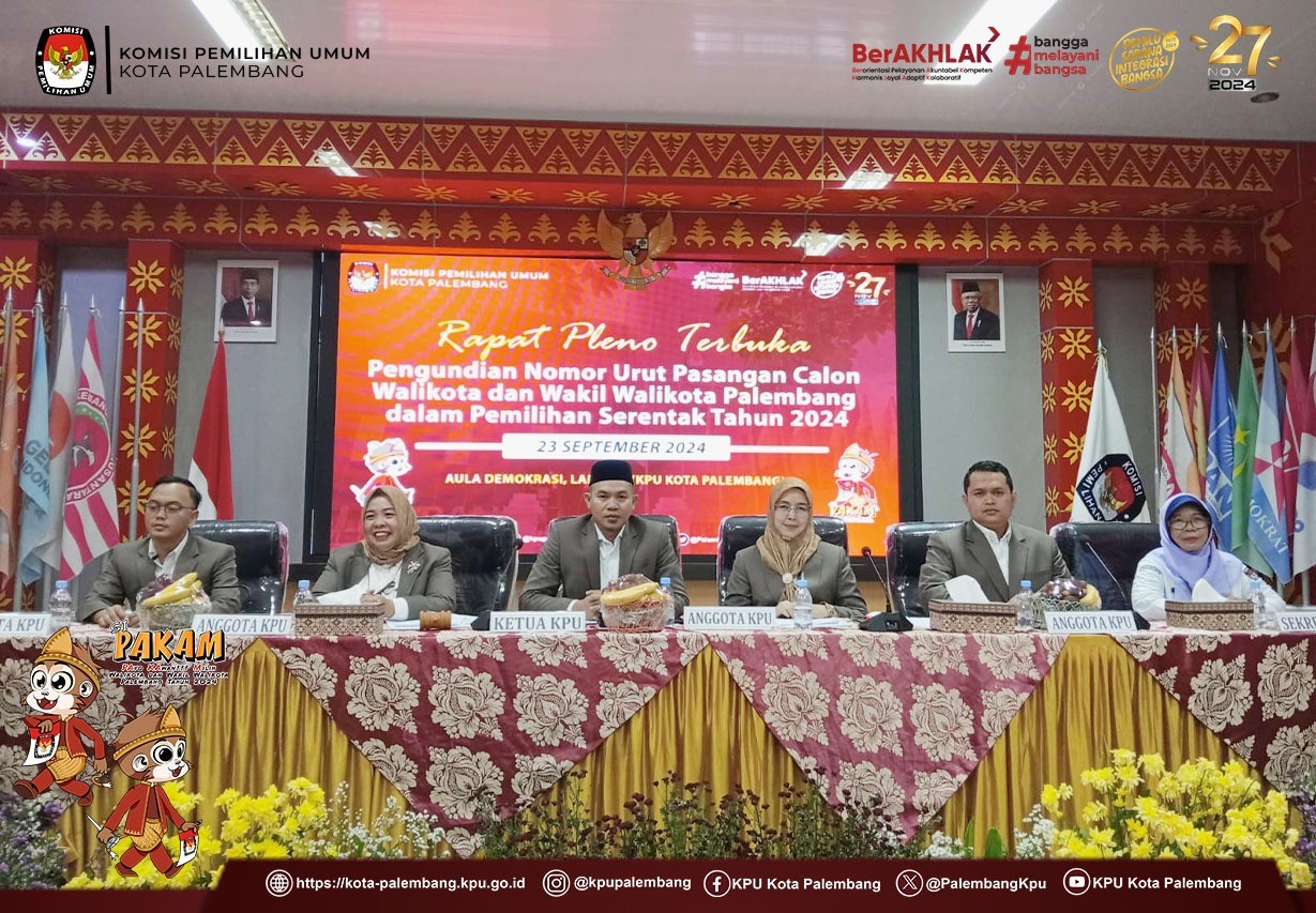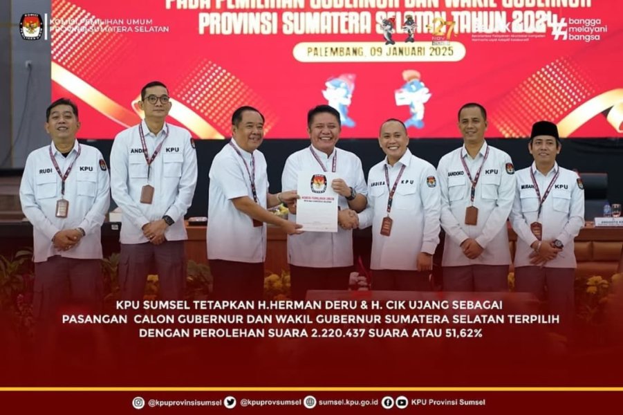 #TemanPemilih KPU Sumsel menetapkan pasangan calon nomor urut 1, H. Herman Deru dan H. Cik Ujang sebagai Gubernur dan Wakil Gubernur Sumatera Selatan terpilih pada Pemilihan tahun 2024 dengan perolehan suara terbanyak 2.220.437 atau 51,62% dari total suara sah berdasarkan Keputusan KPU Sumsel Nomor 4 Tahun 2025 dalam Rapat Pleno Terbuka Penetapan Pasangan Calon Gubernur dan Wakil Gubernur Terpilih pada Pemilihan Gubernur dan Wakil Gubernur Sumatera Selatan Tahun 2024 di Aula Demokrasi Kelly Mariana KPU Sumsel, Kamis (9/1/2025). Pelaksanaan rapat pleno terbuka tersebut dilaksanakan sesuai dengan ketentuan Pasal 62 PKPU Nomor 18 Tahun 2024 tentang Rekapitulasi Hasil Penghitungan Perolehan Suara dan Penetapan Hasil Pemilihan Gubernur dan Wakil Gubernur Tahun 2024.Dalam pelaksanaannya, Ketua KPU Sumsel membacakan Berita Acara Nomor 4/PL.02.7-BA/16/2025 tentang Penetapan Pasangan Calon Gubernur dan Wakil Gubernur Terpilih Provinsi Sumatera Selatan Tahun 2024 yang kemudian akan ditandatangani bersama Anggota KPU Provinsi Sumatera Selatan. Rapat pleno terbuka ini juga dihadiri oleh Ketua Divisi Teknis Penyelenggaraan Pemilu KPU Republik Indonesia, Bapak Idham Kholik, Bawaslu Provinsi Sumatera Selatan, Forkopimda Provinsi Sumatera Selatan, Pimpinan Partai Politik, Pasangan Calon Gubernur dan Wakil Gubernur Terpilih serta wartawan.