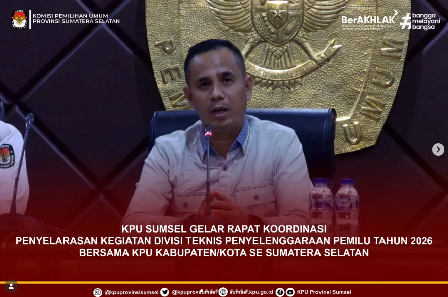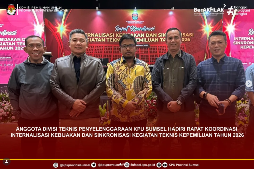 #Temanpemilih, Dalam rangka menyelaraskan kegiatan Divisi Teknis Penyelenggaraan Pemilu Tahun 2026 antara KPU, KPU Provinsi dan KPU Kabupaten/Kota, serta untuk mempersiapkan tata kelola teknis kepemiluan yang lebih terintegritas dan efektif, KPU Provinsi Sumatera Selatan melaksanakan Rapat Koordinasi dengan KPU Kabupaten/Kota Se Sumatera Selatan melalui Zoom Meeting. Senin (9/2/2026).