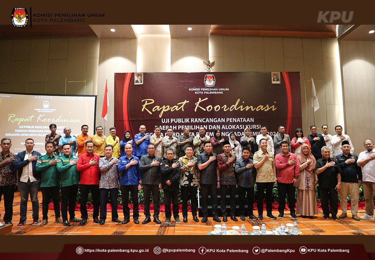 Kamis, 15 Desember 2022 #TemanPemilih, KPU Kota Palembang mengadakan Rapat Koordinasi Uji Publik Rancangan Penataan Daerah Pemilihan dan Alokasi Kursi Anggota DPRD Kota Palembang ada Pemilihan Umum tahun 2024. Yang dihadiri oleh seluruh ketua Partai Politik, camat se-Kota Palembang, Ketua dan anggota Bawaslu, Komandan Dandim 0418, Polrestabes Kota Palembang, Kesbangpol Kota Palembang, Disdukcapil Kota Palembang, Akademisi, Tokoh Masyarakat, Pimpinan Redaksi, Pemantau, Kabag Pemerintahan Kota Palembang, beserta Ketua dan Wakil Ketua DPRD Kota Palembang. Acara dilaksanakan pada pukul 09.00 WIB s.d selesai pada tanggal 15 Desember 2022 bertempat di Hotel Novotel Palembang Acara dilanjutkan pemateri pertama Muhammad Joni, SE., M.SI Divisi Tenis Penyelenggaraan dengan tema Rancangan Penataan Daerah Pemilihan dan Alokasi Kursi Anggota DPRD Kota Palembang dalam Umum Tahun 2024, pemateri kedua Dr. Ardiyan Saptawan, M.Si selaku Akademisi tema Pokok-pokok pikiran kritis terhadap rancangan pembagian daerah Pemilihan Umum Kota Palembang Tahun 2024, pemateri ketiga Zainal Abidin, SH Ketua DPRD Kota Palembang #KPUMelayani #PemiluSerentak2024