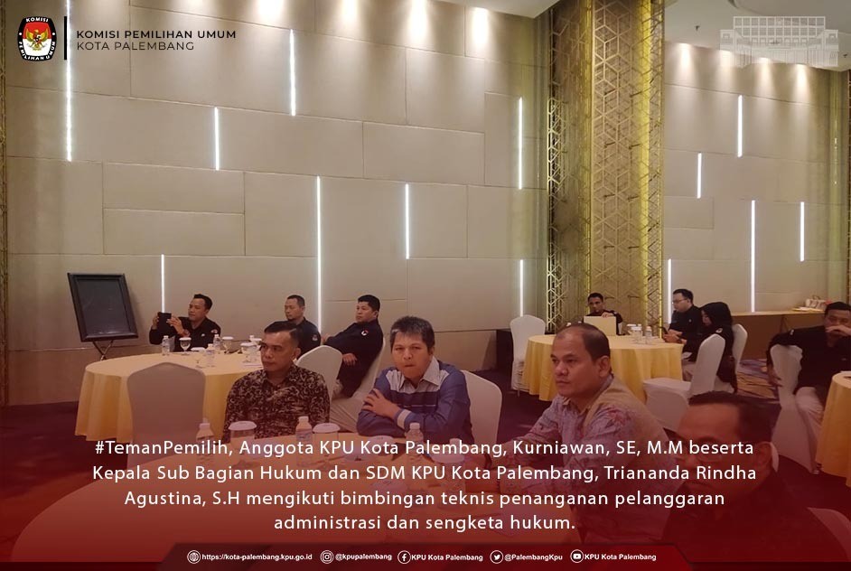 PALEMBANG - #TemanPemilih, Anggota KPU Kota Palembang, Kurniawan, SE, M.M beserta Kepala Sub Bagian Hukum dan SDM KPU Kota Palembang, Triananda Rindha Agustina, S.H mengikuti bimbingan teknis penanganan pelanggaran administrasi dan sengketa hukum di PTUN dengan KPU Kabupaten / Kota se-Sumatera Selatan. Yang diselenggarakan di The Alts Hotel – Rajawali, Palembang, tanggal 4 – 6 Oktober 2022.