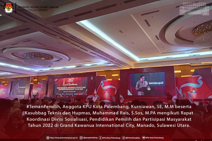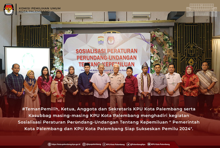 PALEMBANG - #TemanPemilih, Ketua, Anggota dan Sekretaris KPU Kota Palembang serta Kasubbag masing-masing KPU Kota Palembang menghadiri kegiatan Sosialisasi Peraturan Perundang-Undangan Tentang Kepemiluan " Pemerintah Kota Palembang dan KPU Kota Palembang Siap Sukseskan Pemilu 2024".