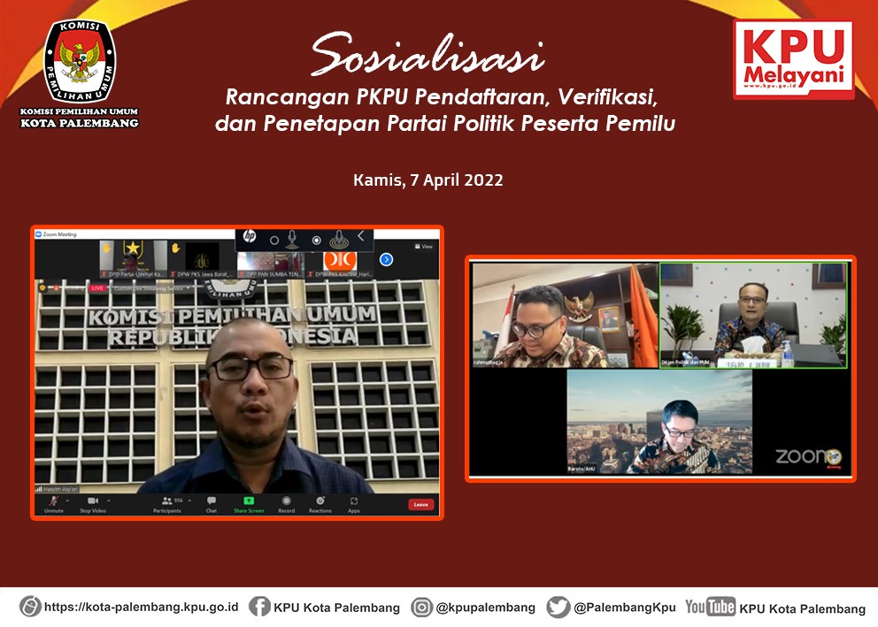 #TemanPemilih, Ketua KPU Kota Palembang di dampingi Kepala Sub Bagian Teknis dan Hupmas mengikuti Sosialisasi Rancangan PKPU Pendaftaran, Verifikasi, dan Penetapan Partai Politik Peserta Pemilu dengan tema "Dukungan Pendaftaran Partai Politik Peserta Pemilu untuk Sukses Pemilu 2024".