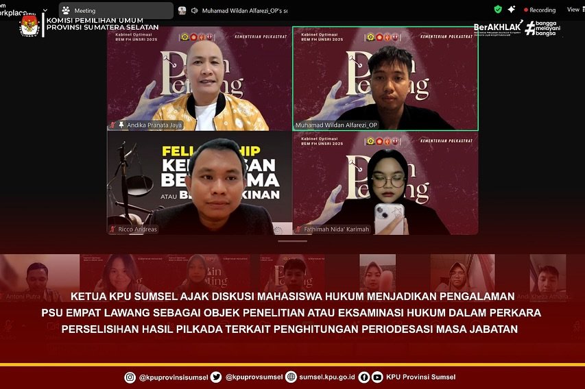 #Temanpemilih Ketua KPU Sumsel ajak mahasiswa Hukum Universitas Sriwijaya diskusi dan menjadikan pengalaman Pemungutan Suara Ulang (PSU) Pemilihan Bupati dan Wakil Bupati Empat Lawang tahun 2024 sebagai objek penelitian atau eksaminasi hukum dalam perkara perselisihan hasil pemilihan terkait penghitungan periodesasi masa jabatan. Hal itu disampaikannya dalam diskusi dan kajian hukum yang diselenggarakan oleh Kementrian Politik dan Kajian Strategis (Polkastrat) Badan Eksekutif Mahasiswa Fakultas Hukum Universitas Sriwijaya (BEM FH Unsri) Kabinet Optimasi bertajuk “Poin Penting Menjawab Tantangan Pilkada untuk Pemilu yang Demokratis” secara daring, Sabtu (14/6/2025). Dalam Diskusinya Ketua KPU Sumsel mengapresiasi inisiatif BEM FH Hukum yang telah mengajak Dosen Hukum sebagai Akademisi dan KPU sebagai Praktisi atau Penyelenggara Pemilu menjadi narasumber dalam diskusi yang menarik itu. Tidak hanya menjadikan PSU Empat Lawang sebagai bahan kajian yang menarik, Ketua KPU Sumsel juga turut mengajak para Gen Z tersebut untuk terlibat langsung dalam penyelenggaraan Pemilu dan Pilkada dengan menjadi Anggota Badan Adhoc (KPPS, PPS, PPK) sebagai tempat belajar problematika di lapangan agar tidak menjadi skeptis dan tetap kritis.