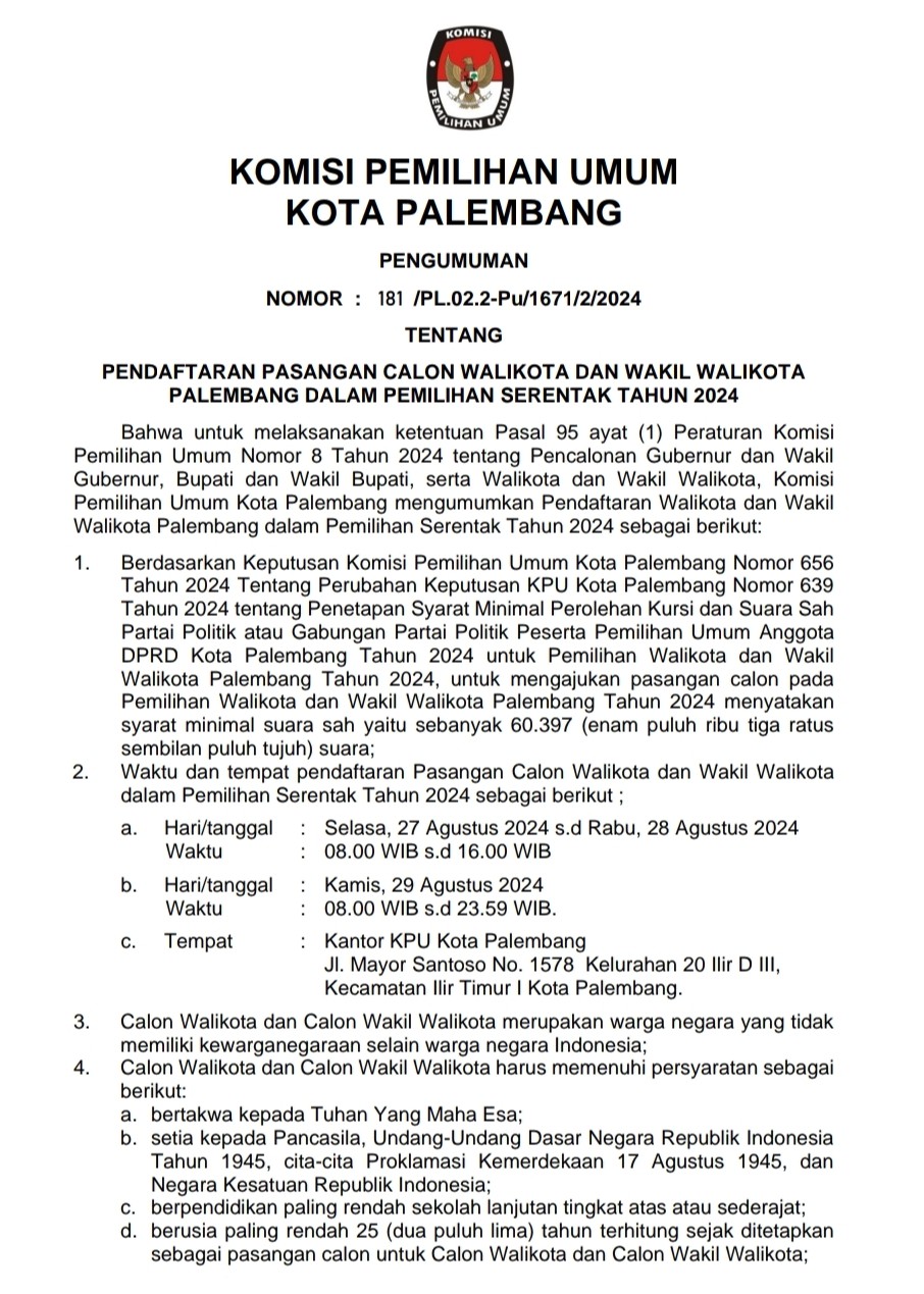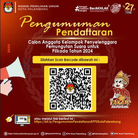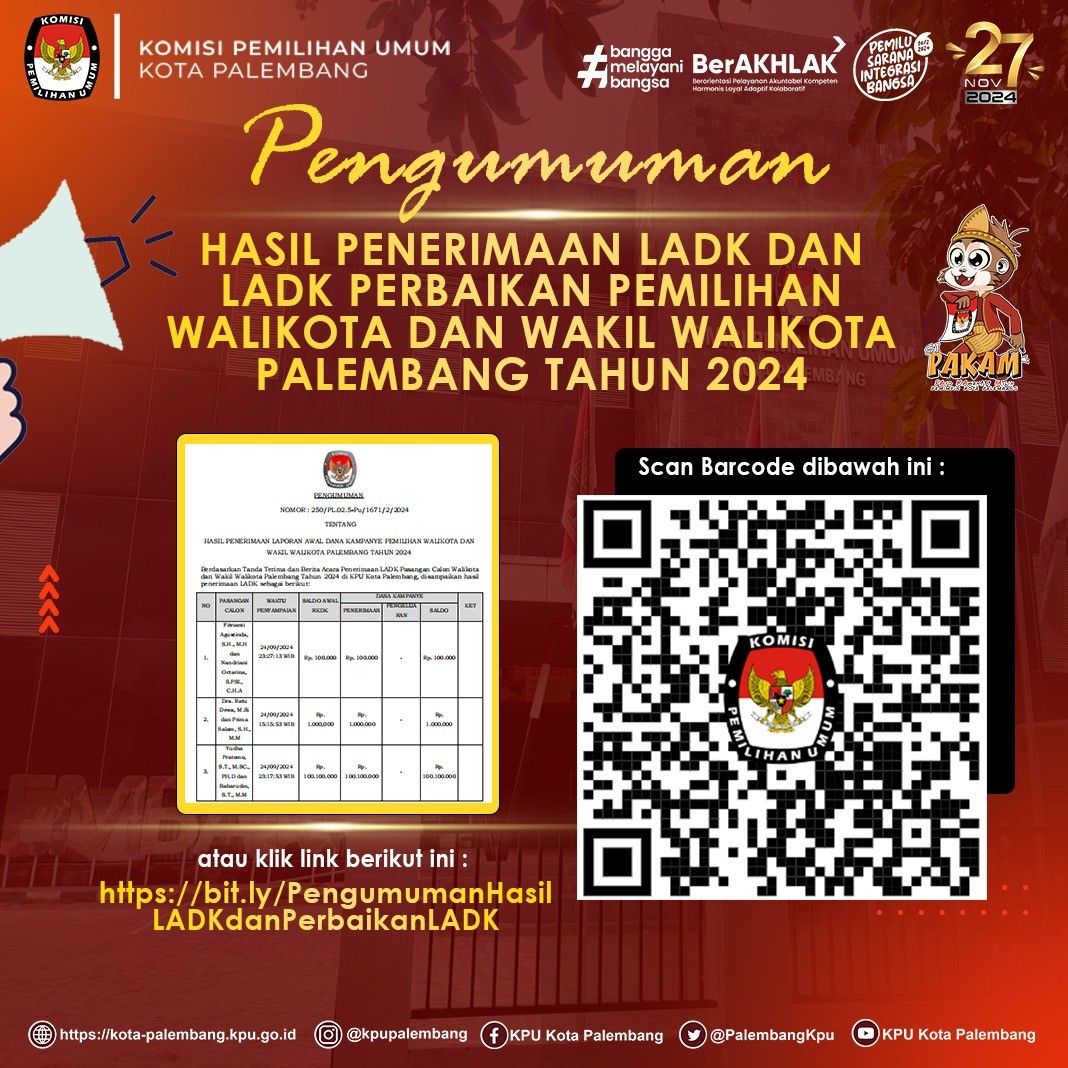 #TemanPemilih, Berikut pengumuman hasil penerimaan LADK dan LADK Perbaikan Pemilihan Walikota dan Wakil Walikota Palembang Tahun 2024. Silahkan scan barcode diatas atau melalui link berikut : https://bit.ly/PengumumanHasilLADKdanPerbaikanLADK